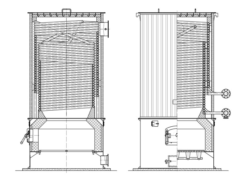 爐體內(nèi)、外螺旋盤管采用多頭、小管徑鋼管制成,盤管的熱膨脹性能好、應力低,安全可靠。